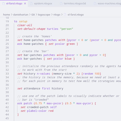 LogoScope is a Visual Studio Code extension that provides syntax highlighting for the NetLogo programming language. It supports all NetLogo file extensions (.nlogo, .nlogo3d, .nls, .nlogox, .nlogox3d) and builds on akash raj’s NetLogo Syntax Highlighting extension, last updated in 2020.