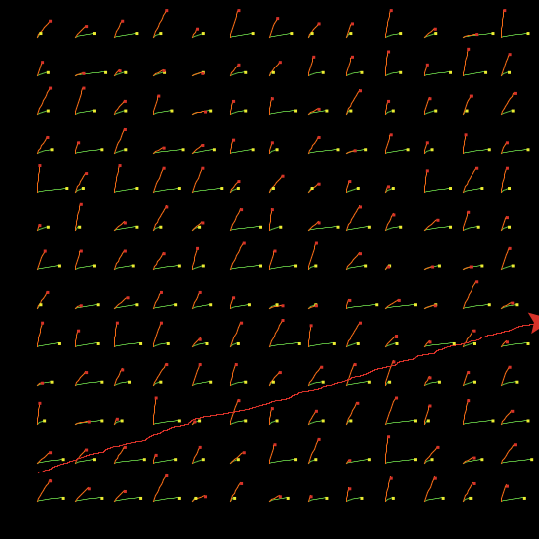 The turtle (ship) starts at the lower left corner. Initially it follows tje sea current (green arrow). After some time I switched to wind based navigation and it follows the wind vector (orange arrow). Note that wind is the dominant vector in this model. I switched to wind two times. You can see how the course changes over time. Below is a run that depends only on the sea current.: